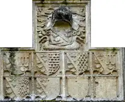 - ^ The 8 shields in the panel show the arms of Luttrell impaling: (from top row left to right): Courtenay of Tiverton, Beaumont (of Shirwell, Devon), Audley, Courtenay of Powderham (the label of three points differenced by three plates on each label) and Hill (his own wife), all wives of Luttrells. The 6th shield was intended to be completed by the sculpting of the arms of his son's wife, which was never effected. Similarly the two completely blank shields intended for use by his grandson and great-grandson were never used. The heraldic achievement on top shows the Luttrell arms in a shield supported from underneath by two Bohun Swans (an emblem inherited from the Courtenays) chained and collared with a coronet, with the Luttrell canting crest of a loutre (otter) above