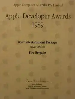 Fire-Brigade won the 1989 Apple Developers Award for Best Entertainment Package