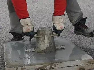 • The cone is placed in the center of the flow table and filled with fresh concrete in two equal layers. Each layer is tamped 10 times with a tamping rod.