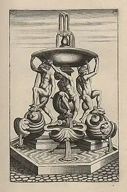 The fountain was designed by the architect Giacomo della Porta (1533–1602) in 1581. He used a design which he repeated in several fountains, which he adapted from earlier ancient Roman fountains. It had a single vasque, or bowl, on a pedestal, from which water spouted upwards and then poured down into polygonal basin.[7] What made the fountain in Piazza Mattei different was the decoration; Mattei commissioned the young sculptor Taddeo Landini, (1550–1596) for his first sculptural commission in Rome, to create statues of four ephebes, or young adolescent men, and eight dolphins. They were originally intended to be of marble but were finally made of bronze, which was more expensive. The Ephebes, in the mannerist style, may have been inspired by eight bronze figures made in 1563-1565 by Bartolomeo Ammannati for the Fountain of Neptune, or du Biancone, in Florence.[8]
