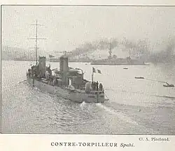 Spahi was ordered from Forges et Chantiers de la Méditerranée and was launched at their shipyard in La Seyne-sur-Mer on 3 May 1908. She was completed in July 1910.[4] When the First World War began in August 1914, Spahi was assigned to the 2nd Destroyer Flotilla (2e escadrille de torpilleurs) of the 1st Naval Army (1ère Armée Navale). During the preliminary stages of the Battle of Antivari, Montenegro, on 16 August, the 1st, 4th and 5th Destroyer Flotillas were tasked to escort the core of the 1st Naval Army while the 2nd, 3rd and 6th Flotillas escorted the armored cruisers of the 2nd Light Squadron (2e escadre légère) and two British cruisers. After reuniting both groups and spotting the Austro-Hungarian protected cruiser SMS Zenta and the destroyer SMS Ulan, the French destroyers played no role in sinking the cruiser, although the 4th Flotilla was sent on an unsuccessful pursuit of Ulan. Having broken the Austro-Hungarian blockade of Antivari (now known as Bar), Vice-Admiral (Vice-amiral) Augustin Boué de Lapeyrère, commander of the 1st Naval Army, decided to ferry troops and supplies to the port, escorted by the 2nd Light Squadron and the 1st and 6th Destroyer Flotillas while the rest of the 1st Naval Army bombarded the Austro-Hungarian naval base at Cattaro, Montenegro, on 1 September. Four days later, the fleet covered the evacuation of Danilo, Crown Prince of Montenegro to the Greek island of Corfu. The 2nd Flotilla bombarded Stončica Lighthouse on the island of Lissa on 19 September. The flotilla escorted multiple small convoys loaded with supplies and equipment to Antivari, beginning in October and lasting for the rest of the year, always covered by the larger ships of the Naval Army in futile attempts to lure the Austro-Hungarian fleet into battle. The Naval Army raided Lissa and the island of Lastovo on 2 November with the destroyer Lansquenet entering Vis harbor and extorting a ransom from the townsmen lest the French bombard the town. As they departed, the French shelled the lighthouse again.[5]