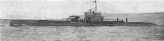 Pierre Chailley′s main armament consisted of 24[5] or 40 (according to different sources) 200-kilogram (441 lb)[2] mines, and she employed the Fernand Fenaux minelaying system, in which the mines were stored in wells placed in inclined external ballast tanks, with a direct release mechanism.[1][4][5] She had six 450-millimetre (18 in) torpedo tubes, four internal at the bow and two trainable external tubes, and carried a total of six torpedoes.[1][4][6] She also had a 100-millimetre (3.9 in) deck gun which fired a 13.6-kilogram (30 lb) shell.[5] Her crew consisted of four officers and 40 petty officers and seamen.[1][2][4]