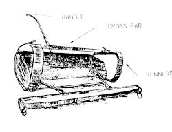 Fresno Scraper (Patent Application). The front drawbar is pulled by two horses, and pulls the scraper proper behind it, while the operator walks behind controlling the depth of scrape with the handle