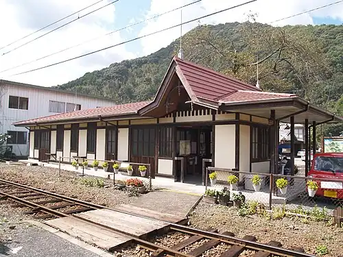 The station has a single island platform and a wooden passenger building connected to the platform by a level crossing. The station is staffed.