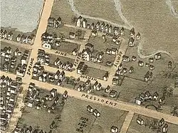 Gadsden Creek was shown on the 1872 Bird's Eye View of Charleston as a creek curving around the corner of "Chesnut" (now Hagood Ave.) and Allway Street. (North is to the right in this view.)