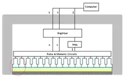 The location of the interaction between the gamma ray and the crystal can be determined by processing the voltage signals from the photomultipliers; in simple terms, the location can be found by weighting the position of each photomultiplier tube by the strength of its signal, and then calculating a mean position from the weighted positions.[2]: 112 The total sum of the voltages from each photomultiplier, measured by a pulse height analyzer is proportional to the energy of the gamma ray interaction, thus allowing discrimination between different isotopes or between scattered and direct photons.[6]: 166