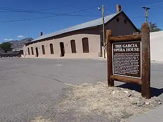 The Garcia Opera House, at Terry Ave. and California St. in Socorro, New Mexico was built in 1886. Its owner hoped to attract opera, but there is no record of any traveling opera company stopping. It did host travelling theatre performances, masked balls, and other functions.[2]