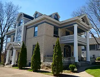 The Garland House is a historic building located in Dubuque, Iowa, United States. Joseph C. Garland settled in Dubuque in 1889 and built a general insurance agency that grew to cover 25 counties in Iowa representing the Northwestern Mutual Life Insurance Company. He was also a community booster and philanthropist. The exterior of his large Georgian Revival home is covered with concrete block veneer, which is an unusual combination.[2] The main facade is dominated by a two-story pedimented portico, the east elevation by a centered semicircular vault dormer, and the rear elevation by a two-story veranda. The house is capped with a hip roof with dormers. It was individually listed on the National Register of Historic Places in 1983,[1] and it was included as a contributing property in the Langworthy Historic District in 2004.[3]