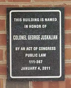 On May 21, 2011, President Barack Obama signed House Resolution 6392 of the 2nd Session of the 111th Congress which designated the post office on 5003 Westfields Boulevard in Centreville, Virginia, as the "Colonel George Juskalian Post Office Building".[47][48] The renaming ceremony was celebrated at the post office on the same day and was attended by friends, family, politicians, former POWs, veterans, and members of the Armenian community.[35] Attendees included U.S. Congressman Frank Wolf, Virginia Delegate Jim LeMunyon and member of the Fairfax County Board of Supervisors Michael Frey.[1][35] During the ceremony, letters of appreciation were read from former Senator John Warner and Presidential candidate Bob Dole.[3]