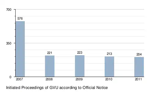 The number of cases opened in the years 2007 to 2011 fell from 576 to 204. The decrease is mainly due to the fact that since 2008 many prosecutors have focused on those investigations in which more than 200 copies of a work were produced. The GVU in its own words has adopted this trend and focuses its investigative activities increasingly on major cases.