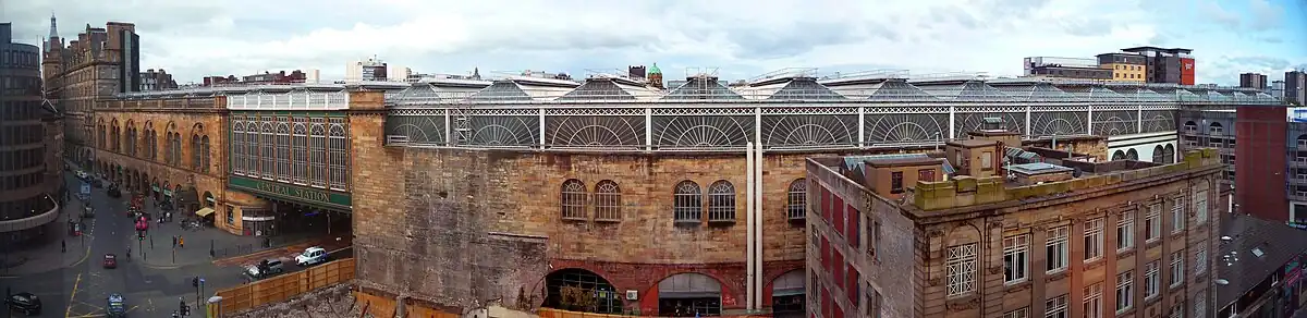 Between 1901 and 1905 the original station was rebuilt.[4] The station was extended over the top of Argyle Street, and thirteen platforms were built.[4] An additional eight-track bridge, the Caledonian Railway Bridge, was built over the Clyde,[4] and the original bridge was raised by 30 inches (0.75 m).[12] Bridge Street station was then closed.[4]