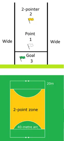 At each end of the field in the following games, there is both a marked scoring area and a separate goal post structure. In these games, the term "goal" is only used for the secondary scoring method of putting the ball through the goal post structure.