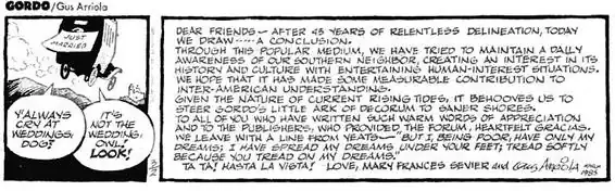 The final strip ran on March 2, 1985, where, in a final effort to avoid the advances of the widow Artemisa Rosalinda Gonzalez, Gordo marries his longtime housekeeper, Tehuana Mama. Arriola used three-quarters of the strip to say farewell to his readers.[11]