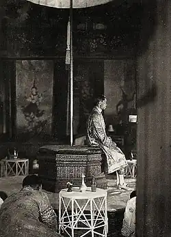 Throughout the period of absolute monarchy, from 1782 to 1932, the Grand Palace was both the country's administrative and religious centre.[22] As the main residence of the monarch, the palace was also the seat of government, with thousands of inhabitants including guardsmen, servants, concubines, princesses, ministers, and courtiers. The palace's high whitewashed castellated walls and extensive forts and guard posts mirrored those of the walls of Bangkok itself, and thus the Grand Palace was envisioned as a city within a city. For this reason a special set of palace laws were created to govern the inhabitants and to establish hierarchy and order.[23]