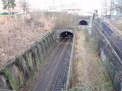 ![]() Trackbed of the disused spur line near the site of the former station, over the cutting of the replacement line | |||||