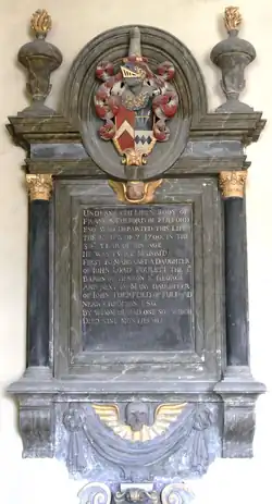 By his second wife Mary Tuckfield he had one son John Fulford (1692–1693) who died an infant.[61] Mary married secondly in 1704 to Henry Trenchard.[70] Col. Francis Fulford repaired Great Fulford House after the extensive damage it suffered during the Civil War.[20] He died without surviving children. His mural monument survives in the Fulford Chapel of Dunsford Church. Inscribed: