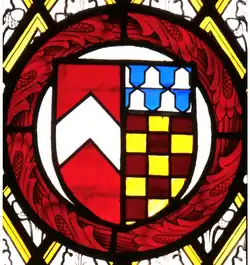 18. ^ Given incorrectly by Vivian, 1895, p.378 as the arms of Cantilupe. The arms of Denys were the arms of Cantilupe debruised by a bend engrailed azure, suggesting some unknown feudal or familial connection with the Cantilupe family. Thomas de Cantilupe (c. 1218 – 1282), Bishop of Hereford, was the first of his family to adopt the jessant-de-lys arms, which he showed reversed, i.e. upside-down, which replaced the ancient Cantilupe arms of three fleurs-de-lys, visible on the Bishop's seal. They became in his honour the arms of the See of Hereford. These arms of Denys were later used by the Tennyson family (perhaps "Denys's son") of which the poet Alfred, Lord Tennyson was a member. The arms of Bonville are not shown on the escutcheon, possibly as John Bonville of Combe Raleigh was a bastard, but the arms of his heiress wife Denys are shown