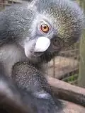 The greater spot-nosed monkey or putty-nosed monkey (Cercopithecus nictitans) is one of the smallest Old World monkeys. It is a guenon of the C. mitis group, native to West Africa and living to some extent in rain forests, but more often in the transition zone between rain forest and savannah. It is primarily arboreal and often associates with monkeys of other species.[3] Both their common names come from the monkeys' prominent white nose.