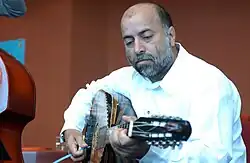 The Greek islands of Kárpathos, Khálki, Kássos and Crete form an arc where the Cretan Lyra is the dominant instrument.[1] Kostas Mountakis, is an example of a person of Greek origin who played the Lyra and helped popularise it in Greece.[7] The Lyra is often accompanied by the Lute (laouto) which resembles a mandolin.[1] Askomandoura (a type of bagpipe) is also used in Cretan folk music.[8] Crete has a unique history of folk dance tradition, which includes swift dances like Pentozalis, Sousta, Syrtos, Trizali, Katsabadianos, Chaniotikos, Siganos, Pidichtos Lasithou, Maleviziotikos, Tsiniaris, Ierapetrikos and Laziotikos.[9]