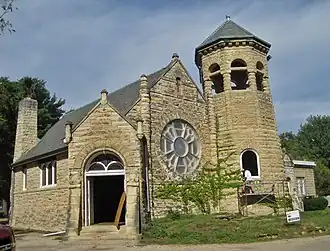 In 1887, the cemetery decided to build a chapel to provide shelter for services during inclement weather. The chapel was designed by Henry Lord Gay in the Richardsonian Romanesque style. Its tower was meant to resember a Roman War Tower. A 7 feet (2.1 m) onyx was installed, engraved with the named of those who died in combat. The chapel may have served as a war memorial until Memorial Hall was constructed downtown in 1903.[1]