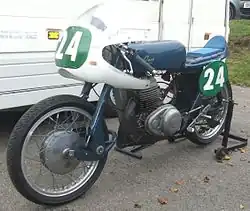 Greeves also made a successful entry into road racing with the 250 cc Silverstone model. These were a production Clubman's model with a reputation for reliability and were chosen to be the standard motorcycles for the Mortimer-Beart Road Racing School.[5] When winning the 1964 Manx Grand Prix, London-based Rhodesian Gordon Keith also took the Greeves racer to the fastest lap of the race – his last of the four-lap race – at 87.6 miles per hour (141.0 km/h), which proved to be the best speed ever by a British 250 cc motorcycle, with a race-average of 86.19 miles per hour (138.71 km/h). From the next five places, four were Aermacchis.[12]