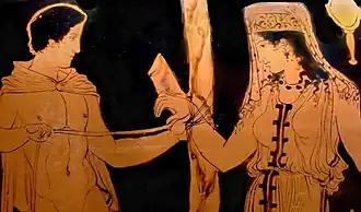Ancient Greek scenes of Southern Italy. A Greek man untying a lady from a tree, probably Perseus with Andromeda, from a vase found in Apulia, c. 4th century BC (left) and Woman holding a mirror and a tambourine facing a daemon. Red-figure oinochoe, ca. 320 BC, from Magna Graecia. Notice the coloured decorative woven stripes hanging on the tambourine, which can still be seen today on "tamburello", the tambourine of Southern Italy.