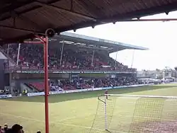 The first season back (1980–81) saw the club finish 7th.[48] Work started that year on a new £1 million stand, originally called the Findus Stand (now known as the Young's Stand) after the former Barrett's Stand had been declared unsafe, the stand opened for the first time on 29 August 1982, as the Mariners played hosts to Leeds United.[1] In the 1983–84 season the club finished 5th in the Second Division after spending most of the latter part of the campaign in the top three promotion places.[49] This was their highest league finish since the 1947–48 season.[23] Grimsby Town's stay in the Second Division ended in 1987, having spent much of the 1986–87 season in the top half of the table, but a run of 8 losses and 2 draws in the final 10 games saw them fall from 8th to 21st before they could return to second tier again.[50]