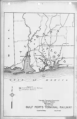 In 1910, the Gulf Ports Terminal Railway was acquired by Southern States Lumber, which operated 68 miles (109 km) of track to move lumber from forests in Baldwin County, Alabama, to its large mill at Muscogee, and on to the port of Pensacola for export. The combined system had a total length of around 80 miles (130 km).[3]