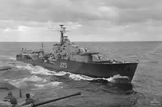 In 1953 Sioux was one of a number of Royal Canadian Navy ships which took part in the Fleet Review to celebrate the Coronation of Queen Elizabeth II.[38] She was primarily used for training purposes thereafter, until being paid off on 30 October 1963. The destroyer wore pennant 225 from 1949 until 1963.[39] In November 1959, Sioux was converted to a frigate with two 4.7-inch guns, four torpedo tubes and two Squid launchers.[40] She was towed to La Spezia, Italy and broken up there in 1965.[3]