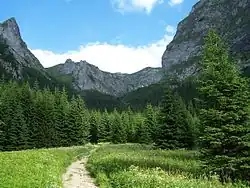 Wielka Polana ranks among the Tatras' most fertile clearings, formed on a former glacial lake bed filled with several alluvial fans, with sediment depths up to 65 meters (213 feet). Both Wielka and Mała Polana were mowed, with hay transported in winter by sled.[1] Grazing occurred on surrounding slopes, gullies, scrublands, forests, and upper valley tiers – Niżnia Świstówka and Wyżnia Świstówka. Pasture areas were used communally, while the two clearings were cadastrally and legally divided, with owners' shares dictating livestock quotas.[5]