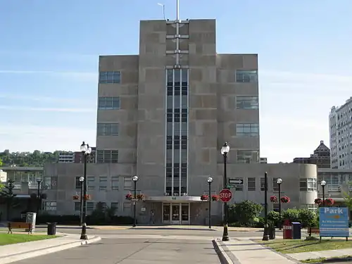 Hamilton GO Centre is a Streamline Moderne building designed by New York architects Fellheimer & Wagner.[2][3] It was planned as a large complex, but was reduced in size to that of a 7-storey office block.[3] It opened in 1933 as the head office and the Hamilton station of the Toronto, Hamilton and Buffalo Railway (TH&B). Passenger service on the TH&B was discontinued on April 26, 1981, and the TH&B merged into the Canadian Pacific Railway in 1987, leaving the facility disused.