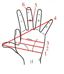 The hand (2) and palm (3) measurements shown, among others, on a human hand | |