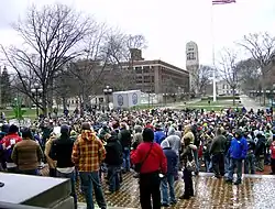 By 1985, attendance at the Hash Bash had dropped to zero, but it soon revived.[8][9] The 2009 Hash Bash celebrated the legalization of medical cannabis in Michigan through the Michigan Compassionate Care Initiative in 2008 and was the largest gathering that the event had seen in years, with an estimated 1,600 participants – an increased turnout which the Michigan Daily attributed to the "wider acceptance of recreational drug use both on campus and across the country".[10] The 2010 Hash Bash had an estimated 5,000 attendees.[11] The 2015 Hash Bash had a record 8,000–15,000 attendees.[1] In 2019, Michigan Governor Gretchen Whitmer celebrated the state's recreational cannabis legalization in a video for Hash Bash attendees, having also attended the event the previous year while running for governor.[12]