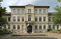 The Hauptstrasse runs right through the Altstadt from Bismarckplatz in the west to the Karlstor in the east, with a slight bend following that of the Neckar river. Between Theaterstrasse and Universitätsplatz, there is a slight rise, which is caused by the alluvial fan of the now subterranean Klingenteichbach stream. The street is around 1.8 km long.[1] It is crossed by numerous streets running from north to south (mostly called Gassen, "alleys") and there are five squares along its route. One of these, the Marktplatz was planned as a market place from the beginning, while the other four - Anatomiegarten, Universitätsplatz, Kornmarkt, Karlsplatz - were created through the demolition of buildings.
