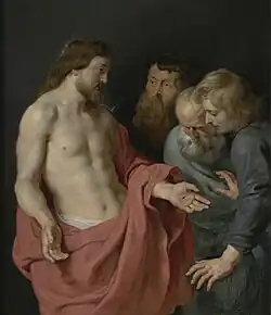 Peter Paul Rubens studied the sculpture during his stay in Rome in the early 17th century and praised its beauty and proportions. The statue likely inspired him for the figure of Christ in the central panel of The Rockox Triptych (Rubens) painted in 1615.[11] Poussin saw in it a canon of ideal proportions[12] and in 1683, Gérard Audran included it in his collection of engravings representing the Proportions of the human body measured from the most beautiful statues of antiquity, meant for young sculptors.[13] Winckelmann recognised it as a statue "of the first class" and much admired the head, "undoubtedly one of the most beautiful heads of a young man from Antiquity", even though he criticised the working of its feet, stomach and legs[14] In Winckelmann's time the statue's identification as Antinous had already been disproved, and the statue was interpreted instead as a Meleager, hero of the hunt for the Calydonian Boar. It was finally identified as Hermes by the scholar Ennio Quirino Visconti, in his catalogue of the Museo Pio-Clementino (1818–1822).[15]