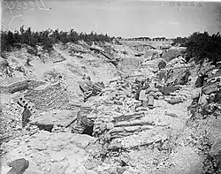 The battalion disembarked at Cape Town on 24 March and proceeded to Dronfield, near Kimberley, where it joined 9th Brigade occupying the south bank of the Vaal River facing General S.P. du Toit's Commando on the opposite side. On 4 April the battalion occupied the stations between the Modder River and the Orange River until it was ordered up to Fourteen Streams on the north bank of the Vaal on 19 May after du Toit had been manoeuvred out of his position, allowing the Relief of Mafeking.[10][94][98]