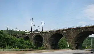 The Coatesville High Bridge is a stone masonry arch railroad viaduct that crosses the valley of the West Branch Brandywine Creek at Coatesville, Pennsylvania. Built by the Pennsylvania Railroad between 1902 and 1904, it has ten arches (eight of 78 feet (24 m) and two of 88 feet (27 m)) and spans a total length of 934 feet (285 m), with wing walls extending it to 1,287 feet (392 m). 78 feet (24 m) high, the bridge was built to accommodate four standard gauge railroad tracks, with a total length of 52 feet (16 m).[1]