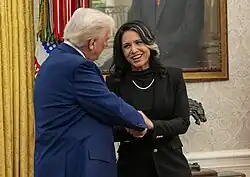 In 2025, Tulsi Gabbard was sworn in as the director of national intelligence[115][116] taking the role of President Donald Trump's top intelligence adviser, and became the first Hindu American to hold a Cabinet-level position.[117][118]