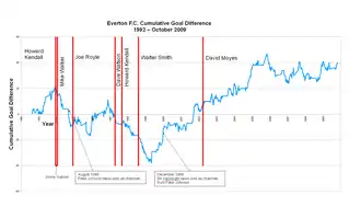 Chart showing the cumulative goal difference of Everton under different managers from the inaugural season of The Premier League to 25 October 2009