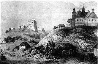The castle and Holy Intercession Church in Sutkivtsi in 19th century by Napoleon Orda