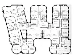 There were originally 17 apartments on each floor, each with one to three rooms.[30] Some units were rented to transient guests and were furnished, while others were intended for long-term residents.[28][30] The smallest units were studio apartments with a bathroom attached to a bedroom.[30] Larger suites had up to two bedrooms, a bathroom, and a parlor.[27][30] Some of the suites had unconventionally-shaped spaces such as circular parlors and octagonal bedrooms, a result of the hotel's irregular plan.[30] Lord & Taylor manufactured the hotel's original furniture. All of the parlors were clad in mahogany and contained a custom writing desk, while the bedrooms were finished in maple.[27] Generally, the floors were made of hardwood, except in the bathrooms, which had mosaic tiles and porcelain tubs.[27][28] The rooms also had large dressers and closets, which were intended to attract women guests.[28] The Belleclaire was an apartment hotel, so none of the rooms had a kitchen or pantry; instead, residents were supposed to eat in the ground-level restaurant.[30] Kitchenettes were added in the 1940s.[20]