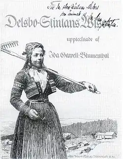 Gawell-Blumenthal was the daughter of a priest from Arbrå. She is best known under the pseudonym Delsbostintan, under which she first performed in 1895 at Skansen as a performer of folk songs and stories from Hälsingland.[4] She toured for many years in the Nordic countries as well as Swedish communities in the US, as a storyteller of humorous Hälsingland stories, often with musical illustrations on the spilåpipa and singing.[5][6]