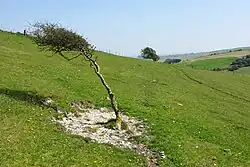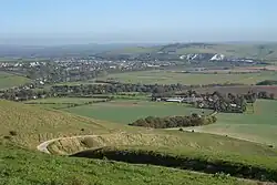 The Downs to the west of Iford are impressive. It is the most treeless part of our Downs without the deep-cut bostals (tracks) visible in other parts, as medieval traders and herders descended these slopes comparatively rarely. At the top of the scarp in this area are three hills: Front Hill, Iford Hill and Swanborough Hill. Across the ridge is the line of the South Downs Way.Unfortunately despite passing close to the designated Iford Hill slopes, it does not actually pass ancient Downland pasture, nor does it benefit from the flowers and wildlife that survive off it. Three ancient barrow clusters have also been lost to the plough on Front Hill.[9]