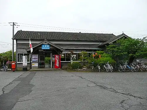 The station consists of two side platforms serving two tracks. Both tracks run on the south side of their respective platforms, suggesting that platform 2 was once an island platform but the middle line has been removed. The station building is a wooden structure of traditional Japanese design and houses a staffed ticket window, a waiting area and an automatic ticket vending machine. Access to the opposite side platform is by means of a footbridge.[2][3][4]