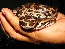 The rock python's color pattern is whitish or yellowish with the blotched patterns varying from tan to dark brown shades. This varies with terrain and habitat. Specimens from the hill forests of Western Ghats and Assam are darker, while those from the Deccan Plateau and Eastern Ghats are usually lighter.[8] All pythons are non-venomous.