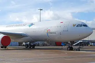 Garuda Indonesia Airbus A330-341 on a state visit at London Heathrow Airport in 2012. Note the national emblem near the cockpit window assigned only on Garuda Indonesia aircraft carrying the president.