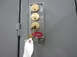 In order to obtain the keys in this system, a key must be inserted and turned (like the key at the bottom of the system of the picture). Once the key is turned, the operator may retrieve the remaining keys that will be used to open other doors. Once all keys are returned, then the operator will be allowed to take out the original key from the beginning. The key will not turn unless the remaining keys are put back in place.
