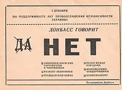 The International Movement of Donbass (Russian: Интернациональное движение Донбасса, romanizedInternatsional'noye dvizheniye Donbassa, IDD; Ukrainian: Інтернаціональний рух Донбасу, romanizedInternatsionalʹnyy rukh Donbasu, IRD), or just Intermovement (Russian: Интердвижение; Ukrainian: Інтеррух), also called the Interfront of the Donbass (Russian: Интерфронт Донбасса; Ukrainian: Інтерфронт Донбасу) was a political movement in the late Ukrainian SSR and the first decade of independent Ukraine. It was founded in 1990 by the members of the intelligentsia in the Donbas region in Eastern Ukraine. It was founded in opposition to the People's Movement of Ukraine, which favored Ukrainian independence from the Soviet Union.[1] Similar Interfront pro-Soviet movements existed in the Latvian SSR, Moldovan SSR and other republics.