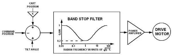 2. The position of the cart relative to track center is stabilized by slightly modulating the null angle (the angle error that the control system tries to null) by the position of the cart, that is, null angle where is small. This makes the pole want to lean slightly toward track center and stabilize at track center where the tilt angle is exactly vertical. Any offset in the tilt sensor or track slope that would otherwise cause instability translates into a stable position offset. A further added offset gives position control.