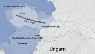 In 1938, German Chancellor Adolf Hitler announced his intentions to annex the Sudetenland, a region of Czechoslovakia with a high ethnic German population. As the previous appeasement of Hitler had shown, the governments of both France and Britain were intent on avoiding war.[2] British Prime Minister Neville Chamberlain and other Western political leaders negotiated with German Chancellor Adolf Hitler and ultimately acquiesced to his demands at the Munich Agreement, in exchange for guarantees from Nazi Germany that no additional lands would be annexed. No Czechoslovak representatives were present at the negotiations.[3] Five months later, when the Slovak Diet declared the independence of Slovakia, Hitler summoned Czechoslovak President Emil Hácha to Berlin and forced him to accept the German occupation of the Czech rump state and its re-organisation into the German-dominated Protectorate of Bohemia and Moravia.[4] Germany promptly invaded and occupied the remaining Czech territories. Although France had a defensive alliance with Czechoslovakia, neither Paris nor London intervened militarily.[5]